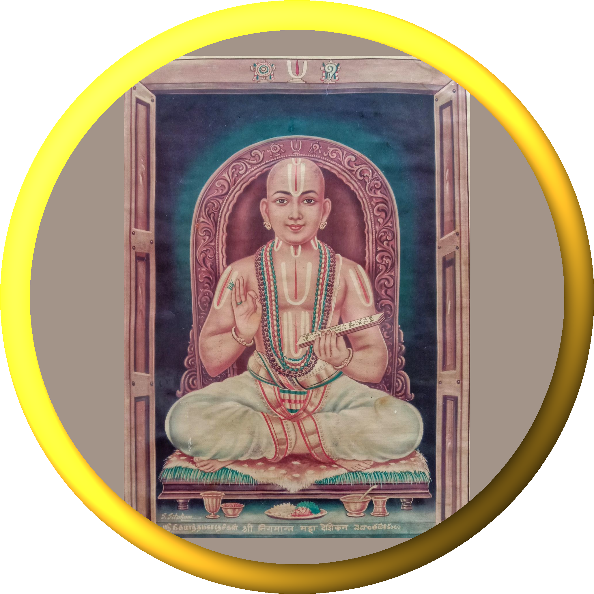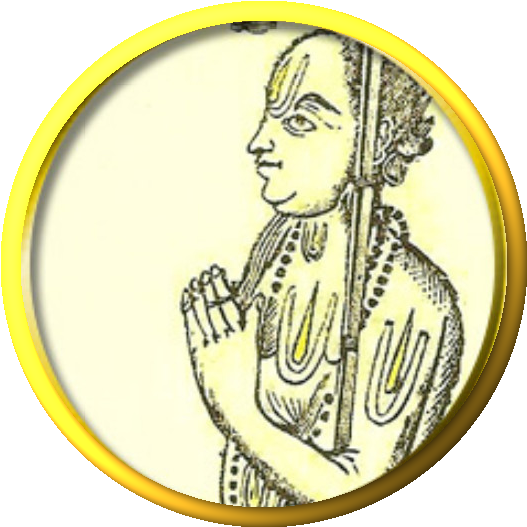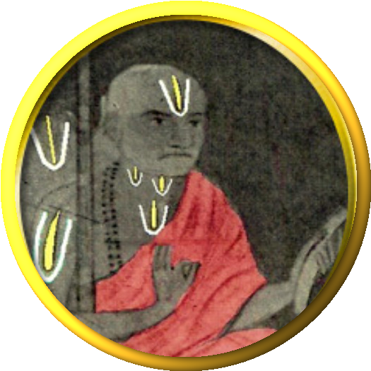Meaning: I surrender at the lotus-feet of Śrī Rāmānujā, whose every moment remains lost in the radiant pair of the Lord’s lotus-feet, who thinks all else like blades of grass, who is the ocean of compassion by virtue of his divine preceptor.